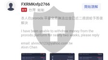 本人在prorods 平台交易无法出金已近二周请给予答复解决 I have been unable to withdraw money from the prorods platform for nearly two weeks, please reply email: alvinch123@yahoo.com.tw Alvin Chen
