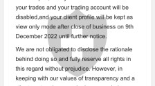 22 年11 月17 日我存入资金以便开始交易,但我收到交易商的一封电子邮件,通知我所有南非人的账户都在接受欺诈调查,无法理解为什么这对我有任何影响,因为我什至没有放置单一贸易。他们建议他们将在2023 年2 月15 日完成调查后释放并退还交易员。发送了大量电子邮件跟进但仍然没有运气,现在我被锁定在他们的门户之外