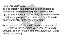 在注册过程中获得收入的人无法解释费用和级别升级。我存放了所有R7000,在提款期间我收到第一封邮件,说我必须支付R5000的OCC费用。在提款过程中,他们发送第二封邮件,以支付R10 000进行级别升级。我意识到自己被骗了