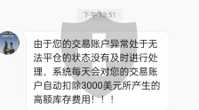 乔帮主 王老师什么的和洪经理是一伙的都是骗子,引导我们把账户给他们操作然后恶意锁仓,不让操作只让补保证金,不补每天扣保管费还不够还要再扣3000美元,不补仓强制平仓了也继续扣。吃相恶心,什么瘫痪在床的妻子,什么几百万美元的账户都是故事。