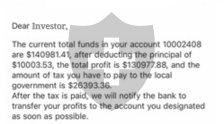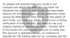 我已将 5000 美元存到Royal Tungsten的钱包。我通过几天的剥头皮交易获得了很多利润,达到了 620 万美元 (usd) Royal Tungsten指出我的交易过于频繁和暴力。所以他们冻结了我的帐户进行调查。我知道他们做调查。但是我一直告诉他们我没有违规。交易时有一些滑点,但我自己使用手机进行交易。经过调查,他们告诉我我不正常并且进行了非法交易。但是,他们没有回答我交易非法的正当理由。他们指出了太多利润丰厚的交易。为了取款,他们告诉我再存入 10% 的资金(62 万美元),这听起来像是骗局。我真的很怀疑是否 Royal Tungsten是否合法。他们没有公司电话线,也没有回复任何电子邮件。 (除非您添加电报,否则您基本上无法联系到客户服务)我今天收到的电子邮件,甚至不是官方电子邮件要求我支付5%的存款来解冻帐户。看起来他们一直想钓我。你不应该向我存钱 Royal Tungsten.他们没有安全保障。