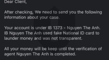 11月15日,我存入了第一笔5000 USDT,第一次的时候,我的交易还算稳定,但是到了12月份,我妈妈的账户就很负了,12月14日达到峰值,我的账户快要烧毁了,继续存入2000 USDT 至交易所。 12月18日,继续充值2000 USDT继续。但我注意到,将USDT存入交易所需要很长时间来处理存款订单,因此12月18日之后,我决定,如果我的账户继续为负数,我将存入越南钱。然后有几天就出现了大负数,我妈的账户上没有足够的钱充锣,我就跟朋友借了钱,让他按照开的账单在iqx上充值越南币,我就这样了。我自己也给她妈妈的账户充过一次功。 1月18日,我看清订单后,尽管账户一开始就显示盈利1382美元,但是 IQX Trade收取 1,131 美元的隔夜账户费用和高达 2,744 美元的中介费。所以我妈妈的账户实际上损失了 2,493 美元。意识到我母亲的账户被抽走并且为负数,我决定接受上述金额的损失,并从交易所提取剩余的资金。 1 月 19 日,我下达指令,提取母亲剩余的全部资金 6,251 美元。 IQX Trade不允许提款并发送涉嫌洗钱的电子邮件,要求我们配合并出现在办公室。我妈妈今年72岁了,在河内8度的寒冷天气里,iqx折磨着一位来回走动的老妇人。当我妈妈加入iqx hn的办公室时,她旁边有2个朋友,那天有还有两个朋友过来要钱,因为iqx没有付钱,我妈妈说,当她看到那两个人录制视频时,那里的男人威胁她并强迫她删除它。 iqx随后不断地发送电子邮件,迫使我年迈的母亲发表声明并按照他们的要求做一切。但最后我们收到了iqx的邮件,说我们洗钱,必须去找ib要钱。这是一种不可接受的欺诈行为,因为我有在iqx平台上存款的所有文件,我没有必要给ib钱,而到目前为止,因为我无法联系到那个ib,我必须上网. 赶紧想办法把你妈妈的钱要回来吧