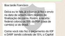 我已经和他们交易了3个月了,一开始感觉很棒,我做了第一笔投资1700美元,他们产生了利润,然后他们要求我测试提款100,好吧,我做了一切,好吧,然后我又捐了 5,000 美元,另外总共 25,000 美元来购买石油和黄金,然后他们告诉我下一个资产将是 AAPL BANK PLUS 25,000 美元,我说没有金额,分析师银行开出了信用证来进行一项操作,这对我来说不会失去操作,他们给了我 27 天的最后期限来还清操作,它是在 11 月 4 日完成的,最后期限25让我还清这张信用证,我疯狂地找钱,我拿了几张信用卡的限额,几个账户才能够筹集到这笔金额25,000美元125,000雷亚尔我无法安排直到25号,他们给了我,直到29号,我把我想要的钱都寄了,直到1号周五我可以寄完所有的钱,然后他们说我会把剩下的钱寄出去。我现在可以提取12000 doloarae,所以我可以支付我借的卡和钱,如果我不能在最后期限前完成,我将面临除总金额外20%的罚款,然后在周一四号他们打电话给我说他们要升级我的账户并进行一些操作来释放我的 12,000 美元提款,他们说这将是周一、周二和上周三,什么也没有,周五我的客户经理打电话给我,说一切都很好,我们将在这个时间进行操作一周才能产生更大的利润,这样我就可以提款,这样我就可以拿到我取出的贷款。简而言之,这笔钱出现在平台上,金额为 73,000 美元,但我无能为力,他们也不回答我的问题。不再发短信了,他们想打电话就打电话让自己放心,我觉得很奇怪,因为在支付银行为我提供的全部金额之前,它每天给我打电话两到三次