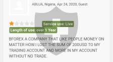 2020年起,我在Bforex交易,入金了 5700 美元,但无法出金,他们还要求我继续入金,我损失了3700美元。8 月 19 日,他们让我建一个头寸,亏损了 3500 美元,他们打电话给我说继续入金来保存头寸。当我拒绝时,他们说很抱歉无法关闭头寸。我多次尝试出金但都失败了。