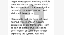 12 日,我又赚了 1000 美元。然后我的取款菜单被删除了。我被告知要等待 14 天到 1 个月。但是现在我的账号被无故封禁了。我的利润和资本金没有退还。