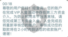 参加VIP活动 没有事先告知游戏规则 不能有第三方帮忙入金 活动参加就要完成 要不然对你提告 要出金的时候 再说是有第三方介入成高风险用户 洗钱 无法出金! 要你时间内补齐资金 然後再说不补齐 扣里面几趴当作违约金