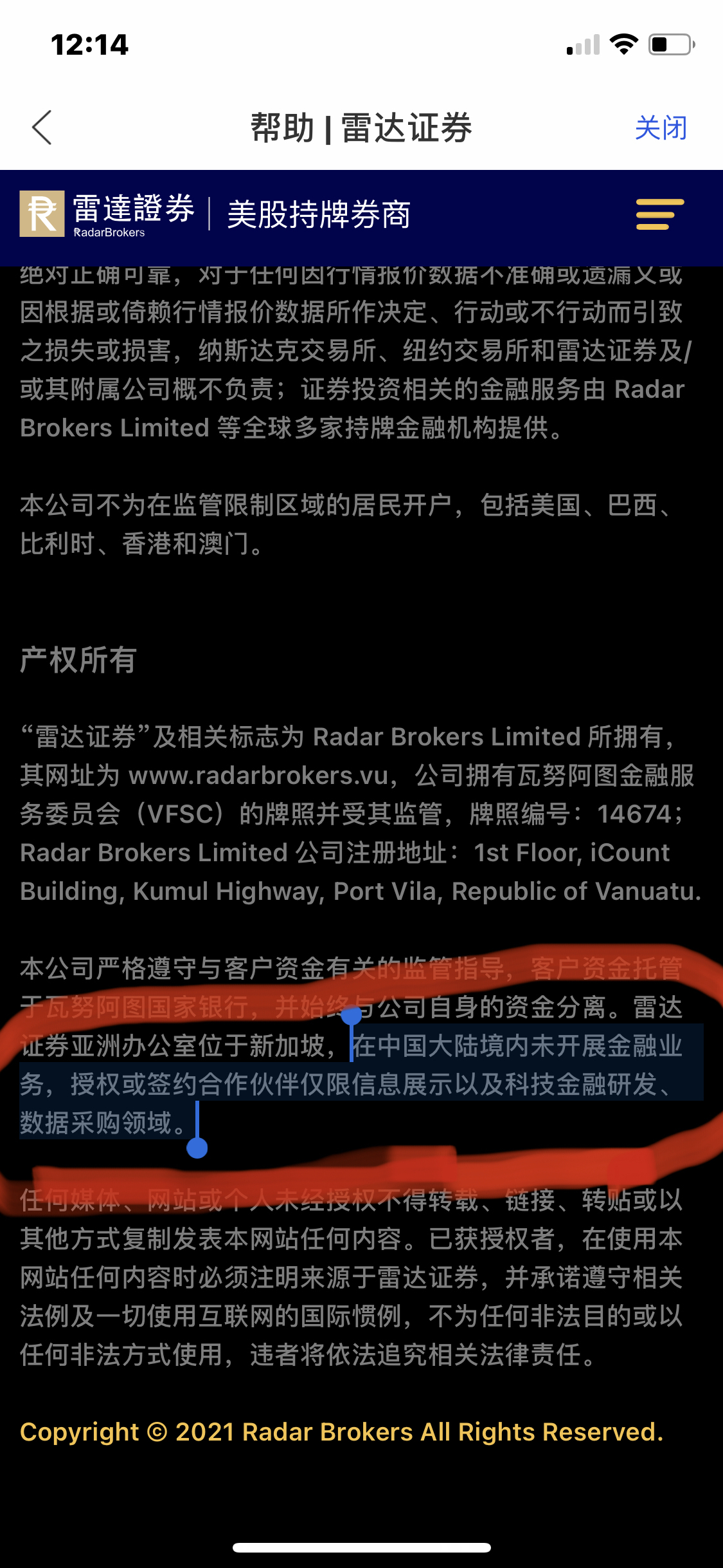 可以查询到两个雷达证券,其实是同一家,换了个马甲而已,我来给你们证明一下哦,雷达证券网站的截图,www.radarbrokers.com这是第一个那个问题雷达证券的网站吧,那么雷达证券在网站贴的雷达证券官网也是同一个,有图有真相哦,下图来自雷达证券网站,雷达证券不用狡辩,我是最了解雷达证券的,我的料多的是,假的真不了,换个马甲我认识你,看下图吧,郑重提示大家,请远离该平台。
