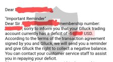 一个美丽的金发女孩通过约会应用程序联系我,并告诉我她通过外汇交易赚了很多钱,让我切换到 watsapp。她说她用Glluck Limited,在名为 MT4 的应用程序上进行交易。她在网上认识我后的一段时间内与我确认了关系,我同意尝试投资。最初一个多月我获得了一些利润,然后有一天失去了我的全部投资。后来她让我再投资一点,并说损失的资金可以收回。最终,当这些资金也因她的一个操作而丢失, MT4 上的账户余额变为负数。几天后,我收到了 GLLUCK 的一封邮件,建议我支付超过 500 美元的负余额,否则他们可以采取措施。请参阅下面的邮件。我应该支付这笔钱吗?
