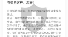 Withdrawal审核未通过 尊敬的客户,您好! 很遗憾地通知您,您的Withdrawal的申请审核未通过。 原因:尊敬的陈彦斌阁下, 目前已收到你的出金申请, 由于您是第一次出金,并且交易手数未达到50标准手, 由于通道费用的原因,需要扣除掉500USD的通道费用,请你知悉。 若你坚持出金,我们会为你支付扣除通道500USD额外的金额, 同时,温馨提示阁下,若你交易满50标准手, 我们将不再收取你的任何出金手续费。 此次拒绝你的出金申请,万分抱歉,请你谅解。若你知悉以上信息后,仍要出金,请重新提交出金申请即可。