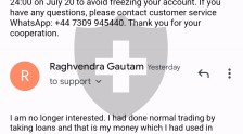 他只让我出金一次,出了21美元,再次申请出金时被拒绝,我的钱被全部冻结。我联系客服想要拿回我的钱,不要利润。 他们只回复了几句,最后就被拒绝了。 请帮帮我