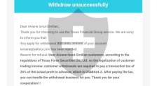 我被骗使用Texas作为 MT5 交易商的平台。经过几次交易和存款后,我试图提取一些资金。但Texas要求每次提前支付 8.524,2 美元。骗子是一个美丽的新加坡女孩,她利用了我的信任。