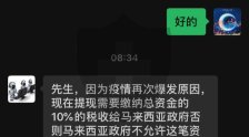 先生,因为疫情再次爆发原因,现在提现需要缴纳总资金的10%的税收给马来西亚政府否则马来西亚政府不允许这笔资金汇入您的账户。并可能将对您的银行账号进行永久冻结。