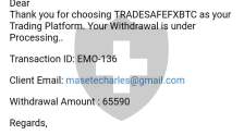 亲爱的先生/女士,我是 Charles kgake mohlala,被Tradesafefxbtc骗了,那个自称Francis mafilikoane的黑人就是将我介绍给交易平台的人,之后他将我介绍给约瑟夫·鲁宾,我首先存入了3000 ZAR,几天后他们让我存入8000 ZAR,用于软件以保护我的账户,因为我的账户里有 65590 美元,他们要求我存入 ZAR20000 以获取利润。