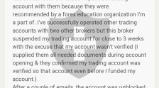 一位客户投诉,交易账户被该交易商暂停了 3 周,即使提交了所有必要的文件,账户也没有得到验证。开户后,他想提取所有资金,但遇到了出金问题。邮件的回复也很慢。