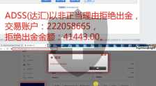 本人经代理商推荐,选择了一家名为ADSS(达汇)平台进行投资,由于有外汇110等网站营造达汇的可信度,放心在6月分批入金交易,但没多久就被限制了交易,递交提现申请后,居然被拒了!理由是“由于账户正在进行交易调查暂时无法申请取款”好端端的交易账号,为什么会被调查?小Y联系客服,通过几次掉线而缓慢的沟通,依然没有得到合理的解释。 l 6.13,注册平台用户。 l 6.14,通过银联和BIPIPAY分批入金,共计入了50多万,收款方是ADSS网站指定的两个农业银行个人账户。 l 6.18-21,进行小批量买卖交易,6.26日进行批量交易,在26日交易了一个多小时后,账户就被禁止交易了,账户被禁止时,账面盈利30%多(由于ADSS提供的杠杆交易,这个盈利在去杠杆后折算,盈利等同于2.5%)。但用户的ADSS账户还是被禁止交易了,次日客户申请出金,但出金被拒。 l 7.8,限制交易,资金被冻结,客户后台无法登陆。 截至目前,仍未有明确答复,比如因为什么异常被冻结,需要调查多久,何时才能正常出金,为什么平台可以随意安一个“异常”的罪名就无端限制了客户的正常交易。