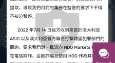 2022 年7月 14 日我方收到来自於澳大利亚 ASIC 以及澳大利亚笞方联合打击跨国犯罪部门的问询,要求我们对一批流向 HDG Markets 疑似存在电信欺诈、金融诈骗且使用 HDG 作为其非法隐匿赃款手段的资金展开调查。我们在收到调查要求後,第一时间冻结了可疑账户并且限制了对应账户的使用以及存取款。但遗憾的是,在两周的申诉期内,我们与该批账户持有者沟通的过程中,并未能收到有力的证明材料,从而导致监管部门对我们的调查进一步升级,目前已冻结我司位於澳大利亚国家银行(NAB)的保证金清算账户以及我司所有的流动性清算账户。