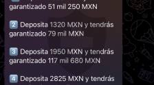 他们向你承诺巨大的利润,由于经济状况,我带着幻想陷入了这个骗局。所有的骗局都是通过 Telegram 进行的,他们一步步解释你应该做什么,我开始时的投资不到 850 墨西哥比索,他们让我等了一个小时,他联系了我,当时他答应说我已经有了收入,但我需要第二次存款1500比索和平台要求的佣金才能将钱提取到卡号我派他来的。他让我等了几分钟告诉我交易已经完成,检查我的银行账户,我去检查了一下,我没有存入任何东西,我告诉他钱不在我的账户里,他告诉我的他要检查这件事是否发生了,结果现在我必须缴税,因为墨西哥当局要求这样做,我就停在那里,我不再存入任何东西,但我把钱丢在了那个人手里骗子。我能拿回我的钱吗?