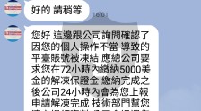 刚开始要求出金说我银行帐户填错,我认了!说要缴钱我也缴了!之後要求出金说我的帐户有问题又要缴钱,我也乖乖配合,後来又说公司帐户有问题,钱要给钱庄出帐,但钱庄要求要十万美,我跟公司协商,他们说会帮我垫付三万美,我付七万美,我最後也缴了!今天说好要出帐却要我先还那三万美才能出帐,我已经卡了6百多万台币了!请平台帮忙