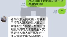 偶然间使用了交友软体认识一名异性,聊着聊着秀出它的期货操作成果,但我没什麽兴趣,後来它用各种方法要我去创STPL帐号、入金,想说小额,不疑有他,我就依照客服的提供的帐户及指示,去入了1万台币,它转给我2万台币,因此我的STPL帐号内合计3万块台币(约1000元美金),几天後STPL这家交易平台寄了封电子邮件过来,称我的帐户内有两笔不同资金,涉嫌洗钱,若没解除要将此案送去管辖司法单位调查,要我向券商平台客服联系,於是向客服人员「FX客服IB8005063」询问这是怎麽回事,客服表示要我72小时内再入金2万美金(约台币60万元)、它人要再入金1万美金,才可以将帐号解除异常状态,我想了老半天,我向客服人员要入金解除异常的法源依据以及你平台的上级单位,讲不出个所以然