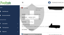 我的名字是 Sittichai Sangdech,在 Meta trade 4 的外汇交易中被骗。交易商是EasyTradeMarket Co,Ltd 在香港使用手机号码 +852 6425 8165。 1)8月份,我通过Whatapp和Line应用程序与陈玉燕女士讨论,她使用+85246486660 与我联系。 2)2021年9月3日,我注册交易账号EasyTradeMeta,在Trader 4 应用程序的市场上交易。 3)2021 年 9 月 6 日,在交易之前,我们已经将钱从 Kasikorn 银行账户 1782601071 转移到泰国的 4 个账户以转移。 4)但是在2021年10月13日,我想出金 18,400 美元。但在超过 5 个工作日的截止日期后失败。 5)2021年10月21日,我向 Pluakdang 警察局举报。