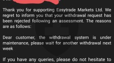我确信EasyTrade Markets Ltd是一个不受监管的平台,因为即使在纳税后他们也不允许提款。他们会不断说服你入金以增加你的保证金。他们六周都没有回应我的投诉,我正在与 traceasset.org进行谈判,以强制提现。比较奇怪的是EasyTrade市场似乎是合法的,但实际上并非如此。每个人都应该小心