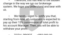 我开始存 R1000,他们说我必须再存 R1000,我在 1 天后就存了 R1000 ,这个女孩说我可以提款,我就这样做了,但我犯了一个错误,她说我必须支付 R3000,因为我的帐户被屏蔽了,当我询问提款时,她说我无法提款,因为他们在我的帐户上收不到信号,我必须支付 R5250 才能出金,我在星期六支付了,但依然无法出金。