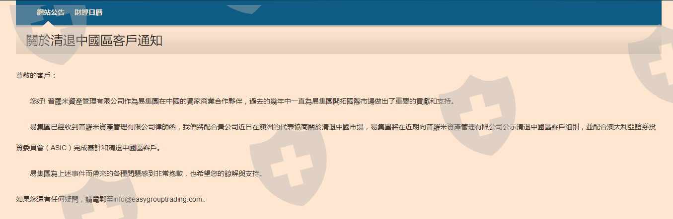 易集团的在中国的代理是一家叫做普罗米的资产管理公司,现在借口要退出中国市场,对中国区客户进行清退,但是说ASIC在审查,所以需要从明年11月份开始清退,用时三年才能完成。对比其他的澳洲监管平台退出中国的流程和时间,没有对比就没有伤害!