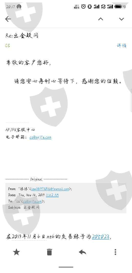 在11月4号开始申请出金,但是现在已经过去半个月依旧没有审核,打电话给客服,但是显示客服电话已经停用,微信公众号询问,公众号显示微信公众号服务商运营出现问题,在官网进行查询,客服完全不回应,我个人怀疑apjfx已经跑路,交易商也各种联系不到,估计现在apjfx已经没有人了。。。。