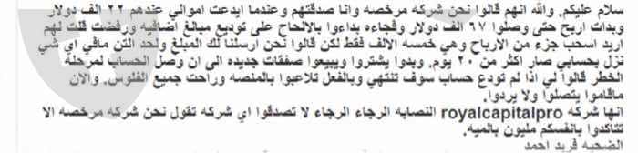 بعد إيداع مبلغ ٢٢ ألف دولار في الحساب و وصول الأرباح إلى ٦٧ ألف دولار ، لم توافق الشركة طلب سحب جزء من الأرباح و هى ٥ آلاف فقط و بعد محاولات تم الموافقة على الطلب ولكن المبلغ لم يصل إلى الحساب حيث كان ذلك مجرد خدعة منهم