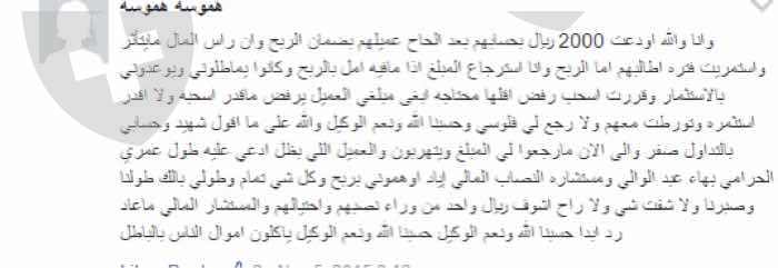 بعد إيداع ٢٠٠٠٠ ريال في الحساب و الحصول على الأرباح و طلب سحب جزء من تلك الأرباح رفضت الشركة المحتالة و جعلت حساب التداول صفر و إلى الآن لم يتم إرجاع المال