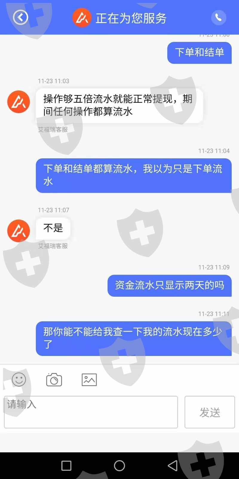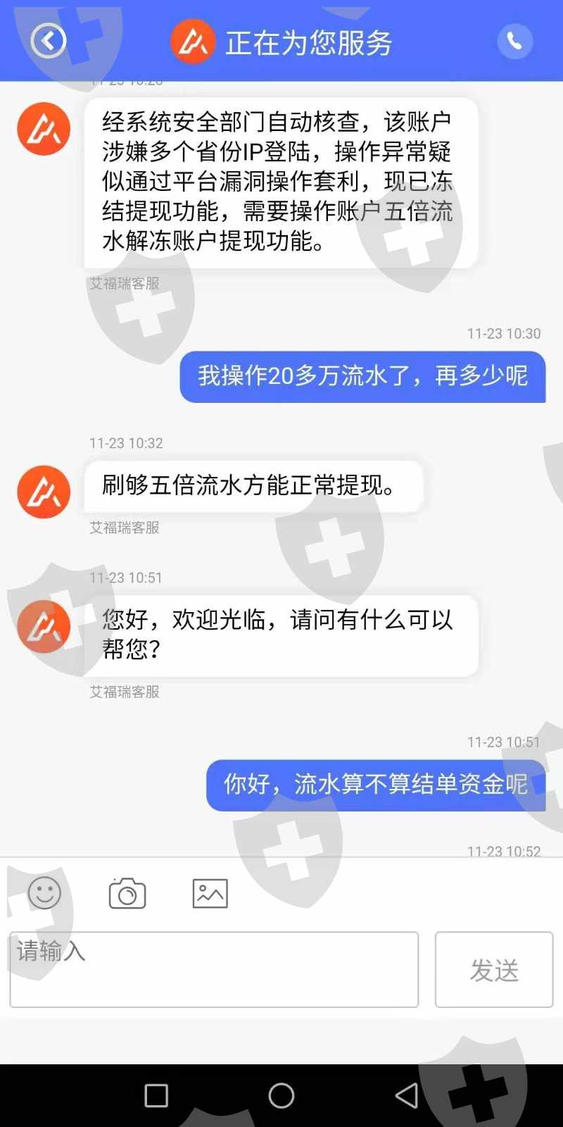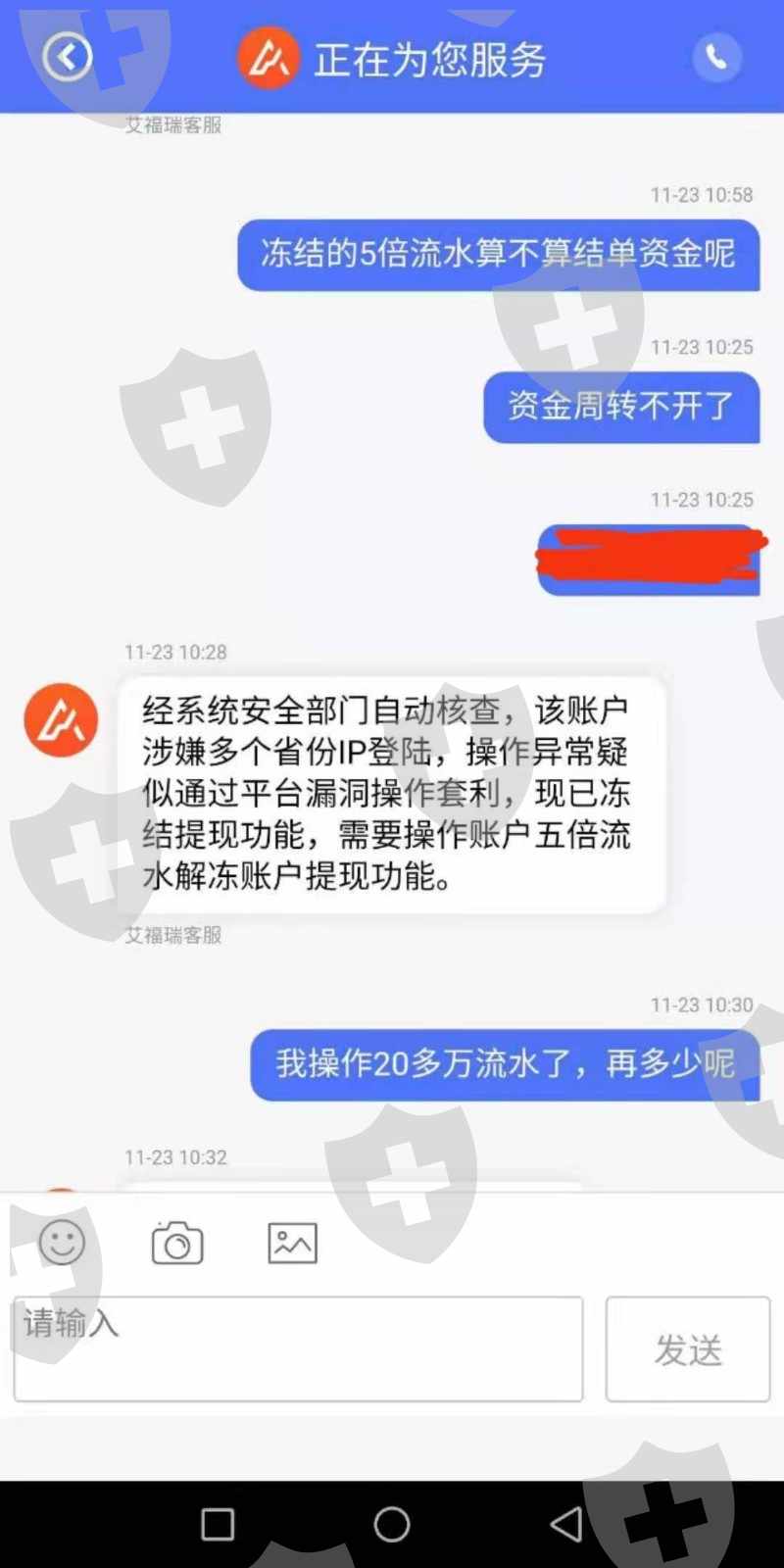 2019年10月25日开始入金操作2019/10/25入金500 2019/10/29入金3000 2019/10/30入金5000 2019/11/11入金39000 2019/11/12入金30000 合计77500元整跟着指导操作目前账户511544元整。2019年10月31日出金9500通过,2019年11月14日提交出金审核未通过说是银行维护国际通道被拒,后面再提交出金就被拒,下面截图就是18号让打五倍流水,给了流水后又让我打20%的资金证明,不敢打,怕打了都出不来了,截图大家看,,还有的图片截不了