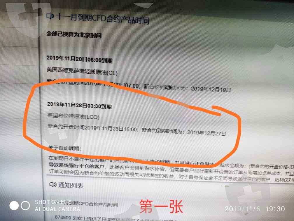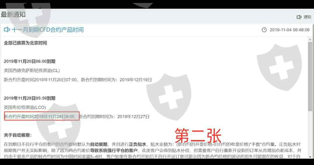 第一张图是拓利平台11月初公告换合约时间为11月28日16点,第二张图是我在11月28日那天晚上看到平台没有更换合约向客服反应,拓利平台立刻修改公告更换合约为11月28日9点,第三张图是拓利平台11月27日21点旧合约最后收盘价64.14,第四张图是对应布伦特01合约(旧合约)28日凌晨5点收盘价64.08,第五张图是拓利平台修改更换合约为11月28日1点,所谓新合约11月28日1点开盘价63.87,拓利平台时间与北京时间相差8小时,其实它只是第六张图布伦特01合约(也就是旧合约)11月28日9点开盘价63.85,而真正新合约却是第七张图布伦特02合约(这才是要更换新合约),新合约11月28日9点开盘价是62.84,这也是当月布伦特主力合约(见第八张图),布伦特主力合约11月28日9点开盘价是62.84,两者价格完全一致。拓利平台不但不履行原先公告11月28日16点更换合约,而且还不更换新合约,仍然采用旧合约价格,造成当前拓利平台布伦特原油价格严重变形,与正常市场价格不符,让客户无法交易而蒙受损失,强烈要求拓利平台履行11月28日16点更换旧合约,并赔偿客户因价格异常,无法交易而造成损