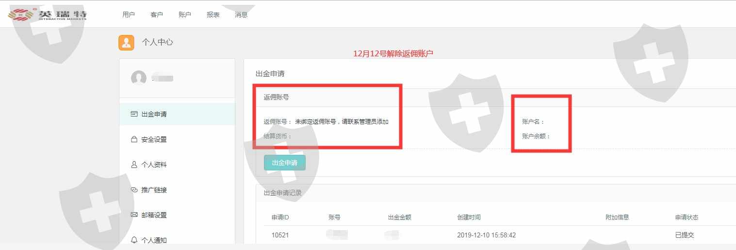 英瑞特平台太黑,大家注意,11月12号提现到通过 到现在资金都没有到账,今天还把我的返佣账户给解除,这周也就几十美金就把我代理的返佣账户解除
