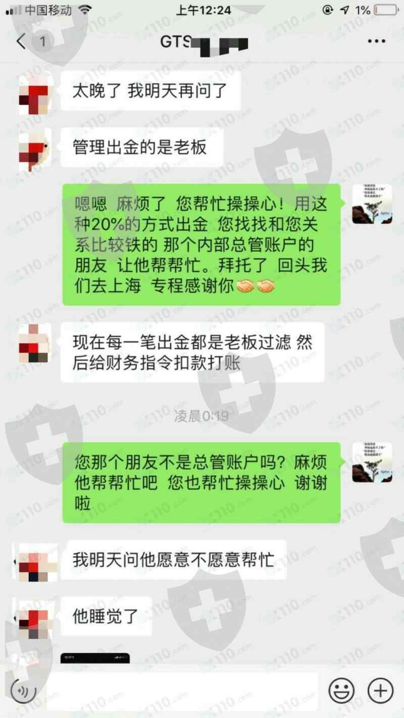 我于去年10月份开始在GTS平台操作,入金4000美金,至2019年2月22日账户余额5500美金,当日申请出金4000美金,至今(2019年12月13日)未到账