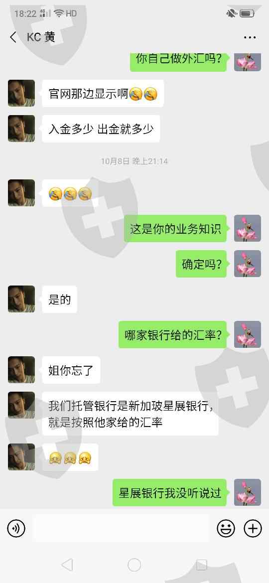 监管虚假,入金到个人账户,出金也是个人账户,谎说托管银行是新加坡星展银行,可是本人所在当地的星展银行答复说没有开展这个金融业务。每次来电都是显示境外的网络电话,挂机后,中国电信来短信说警惕境外电话、防止个人财产受到诈骗和损失。融商环球在网络上的负面很多,客服KC黄说那些负面都是假的,叫客户不要相信,而他自己没有金融分析师执照,经常给客户喊反单。所谓姓张的新加坡国籍“老师”经常喊反单,干扰客户盈利,曾用QQ发来四个5万美金的反单,来电赤裸裸地威胁问本人口袋里、银行账户里有多少钱,敲诈勒索诱导入重金、加入融商环球的战队,开设直播室搞外汇俱乐部,不像正经严肃合法的机构。