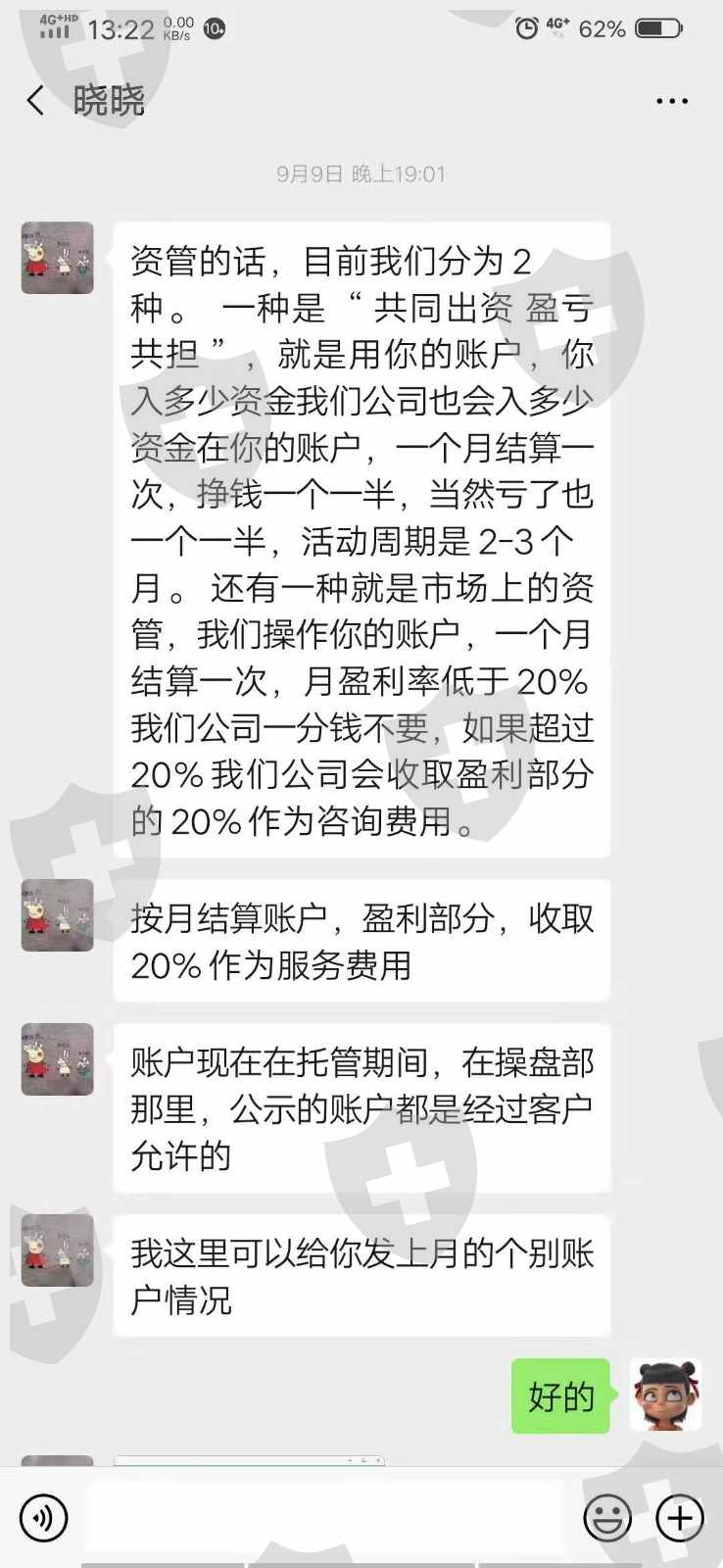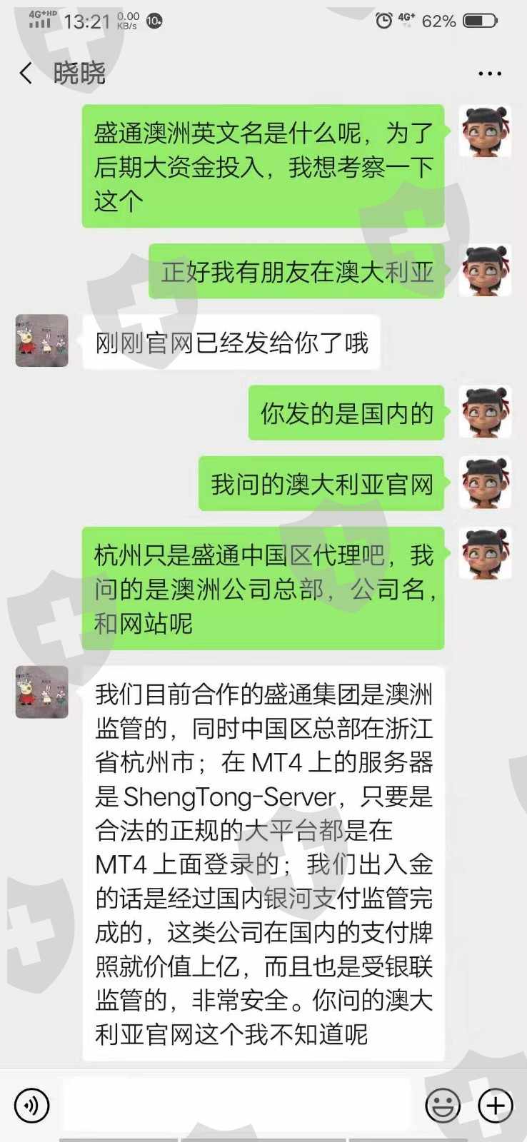 根据客服介绍,他们是盛通集团中国区代理,公司地址杭州市滨江区。9月10日投资1万美金,双方合资2万搞资管,10月18日账户亏损到4110美金,本人提出结算提款,客服晓晓(实名可能为张晓)拒绝提款,说要等到12月10日。12月16日本人提款,至今未到,联系客服晓晓将我拉黑,所谓的“汤老师实盘5群”里面也没人答复,无可奈何选择报警。