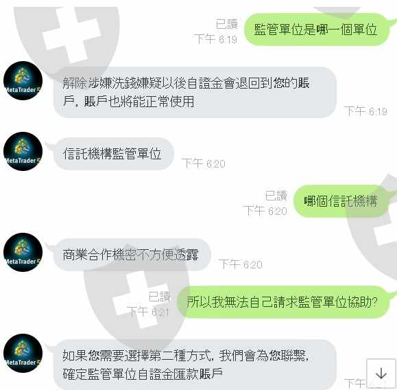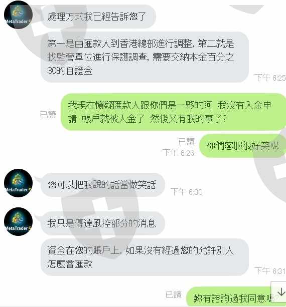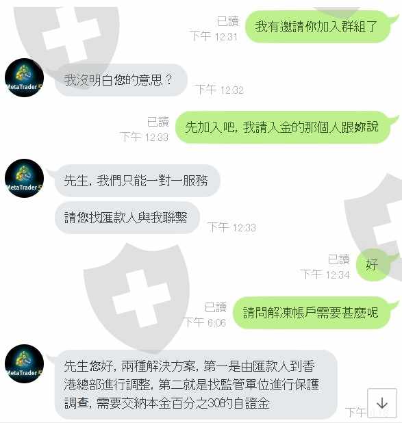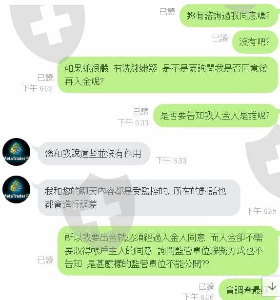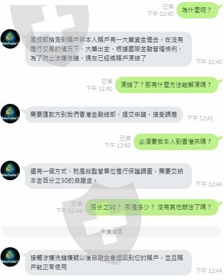 1.到NFA查詢不到該平台接受監管(連資料都搜尋不到1筆)2.由外地的人入金不會經過本人同意(出金時告知你現在有洗錢嫌疑所以凍結帳戶)3.詢問客服有關監管機構的問題都以商業機密為由不予告知4.想要解凍帳戶必須要匯款人親自到香港一趟或者繳納30%的自證金5.以高倉息為由吸引入金(達5萬可取得月息3.2-3.6%,並且是以帳戶總資金計算)6.以客服只能1對1服務為由,不接受群組的對質(我.客服.入金者)7.平台是匯款人介紹,且匯款人是VIP,而匯款人可以直接跟客服取得我的資料