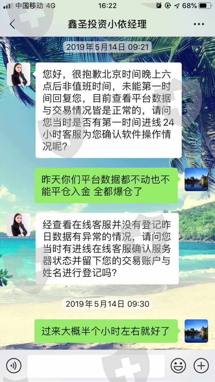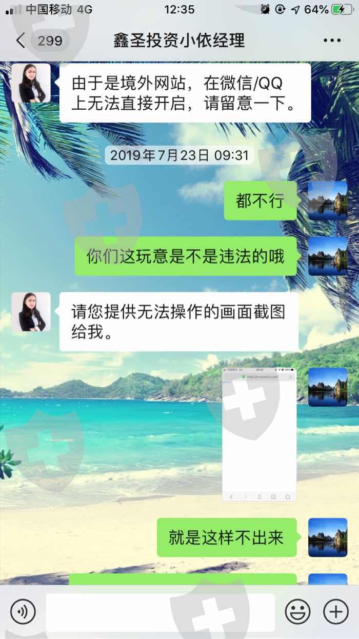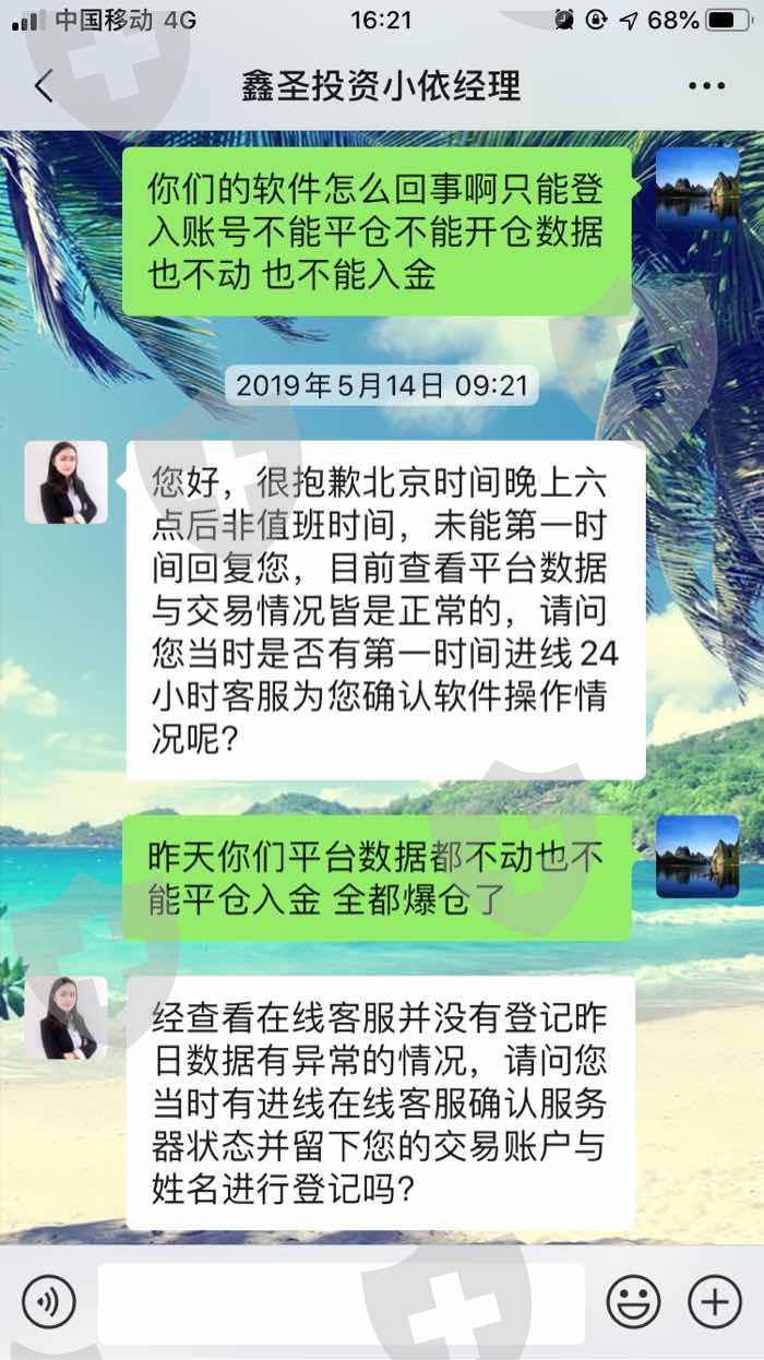 我跟随鑫圣平台的分析师做单,在跟随做单过程中问题不断,APP软件问题,网络问题,分析师盈利一点就出,亏损一直扛着(故意)等问题。和平台理论平台直接封号不给说法,就说此账号以及交由法务部门处理,但是一直也没有处理。后我报警处理,直到最近看到有金融人士发布消息说鑫圣投资平台最近一直在跟换网站IP和办公地点,后我通过调查发现鑫圣投资平台已经停止经营,更换全新的APP叫做期货黄金宝(ios版),请大家注意这是个骗子, 骗完就换马甲继续骗。
