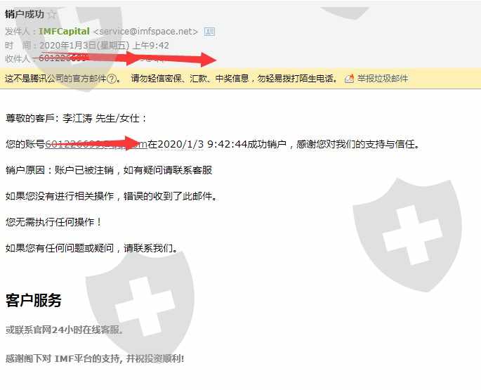 听朋友介绍IMF出金快,然后入金试试,入金190美金,刚开始还可以,交易速度也挺好,中间出了一次金,等第二次出金的时候钱没到账,直接给我发邮件,单方面注销我的账号。