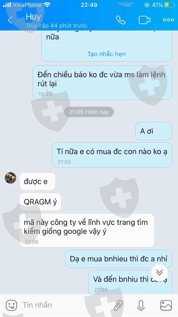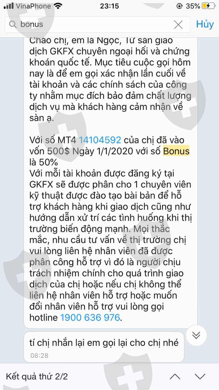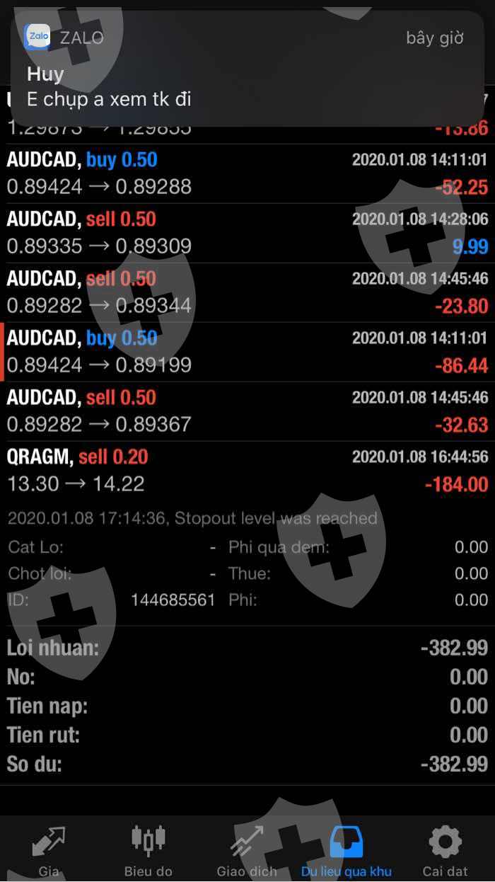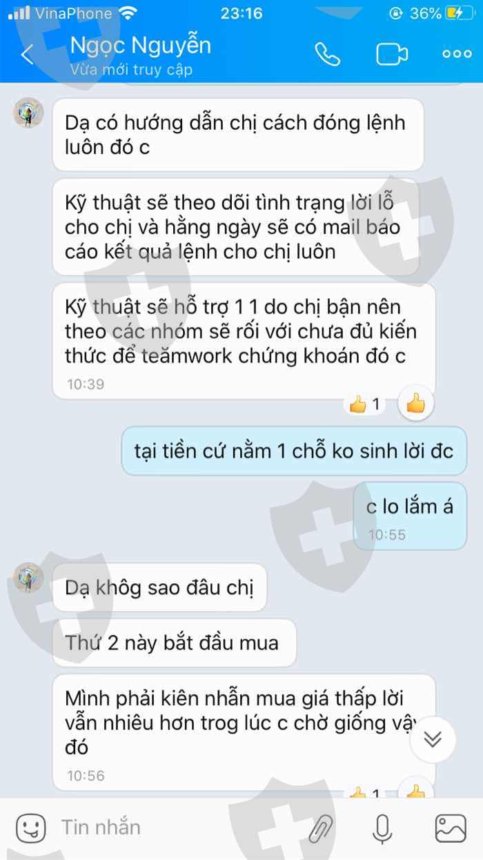 Kỹ thuật viên lừa khách nói khách theo 3 ngày. Đến nỗi cháy tk. Kêu kèm 1-1 nhưng ko hề có. Mua con vàng chạy gần 2 tiếng cũng lệnh 0,2 mà -76$. Nhưng riêng mua con quora từ 13.30 lên 14.12 thì thị trg đứng im 3 tiếng đồng hồ, đến nay chưa chạy. Chưa đầy 10p đi muôn 184$. Tự động cắt lệnh mua có 0,2. Gọi cho kỹ thuật thì tắt máy, ko trả lời. Một kỹ thuật viên khác thì chặn hết khách hàng. Giờ kêu là nếu vài ngày nữa vẫn đứng im mới đền tiền cho khách.