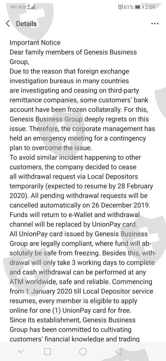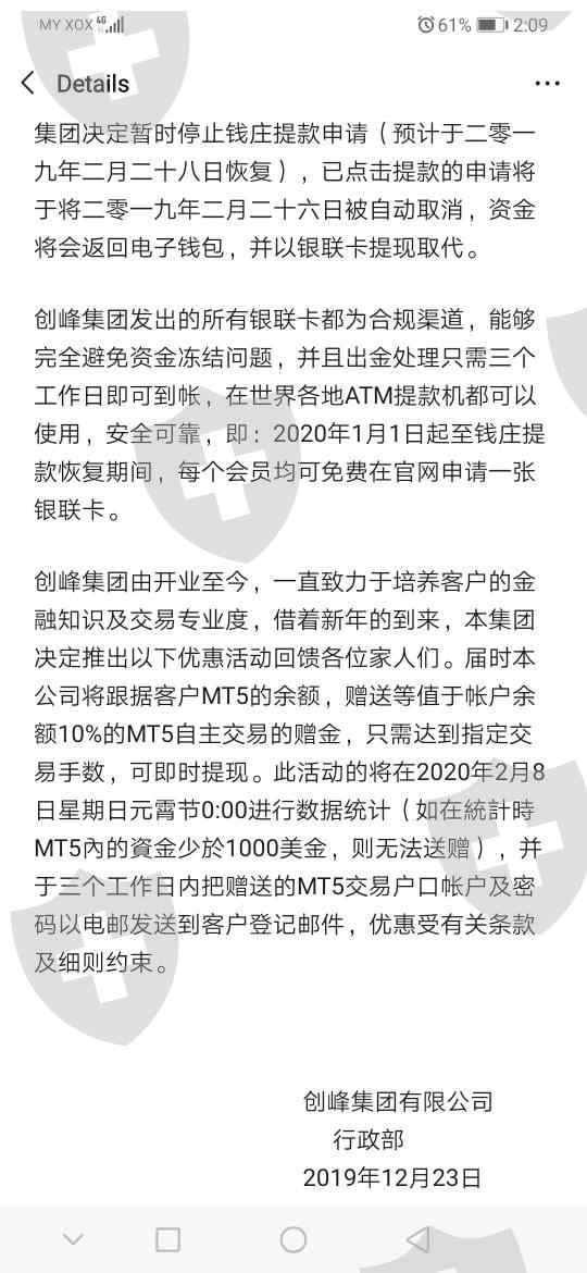 公司于23号12月的通告说本地银行出金将会停止办理,要求会员申请免费的银联卡来取代出金方式。可是目前会员已经拿到卡,出金还是迟迟尚未批准。