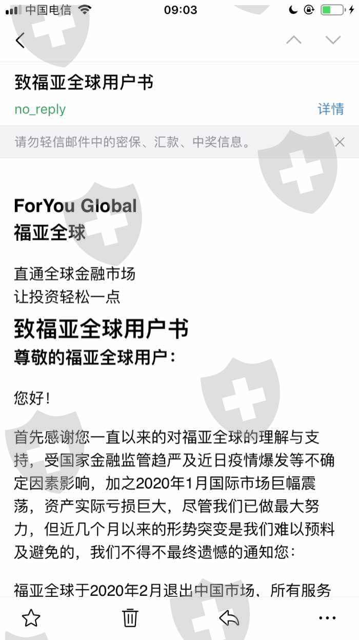 福亚全球,突然给发个邮件,说退出中国市场,结果网站打不开,电话也打不通,网站打不开