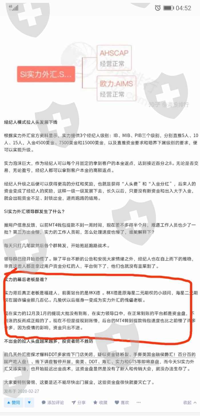 实力背后真正老板是福建人,前面站台的是林X德 。林X德是原海星二元期权的小顾问,海星二元期权在国诈骗金额几百亿。几蛰伏以后摇身一变成为实力外汇的傀儡老板。
