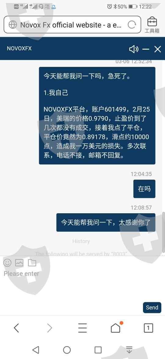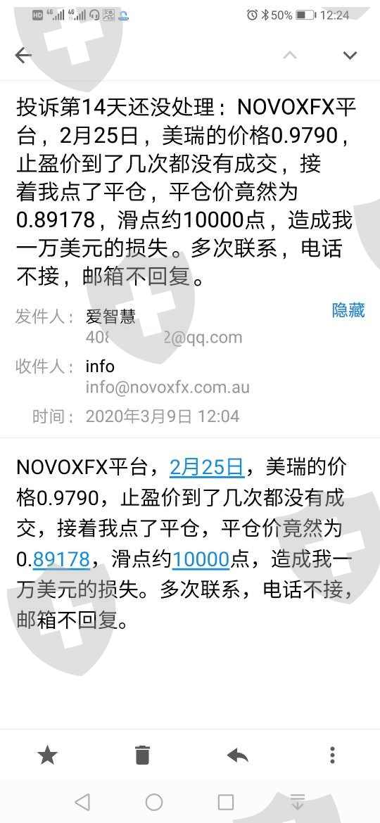 投诉第15天还没处理:NOVOXFX平台,交易账户601499,2月25日,1标准手美瑞的价格0.9790,止盈价到了几次都没有成交,接着我点了平仓,平仓价竟然为0.89178,滑点约10000点,造成我一万美元的损失。多次联系,电话不接,邮箱不回复。