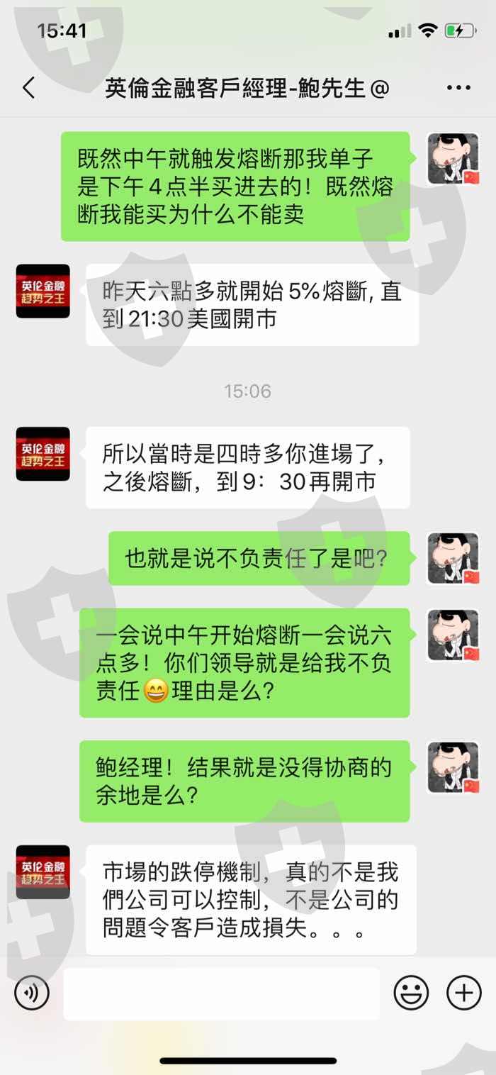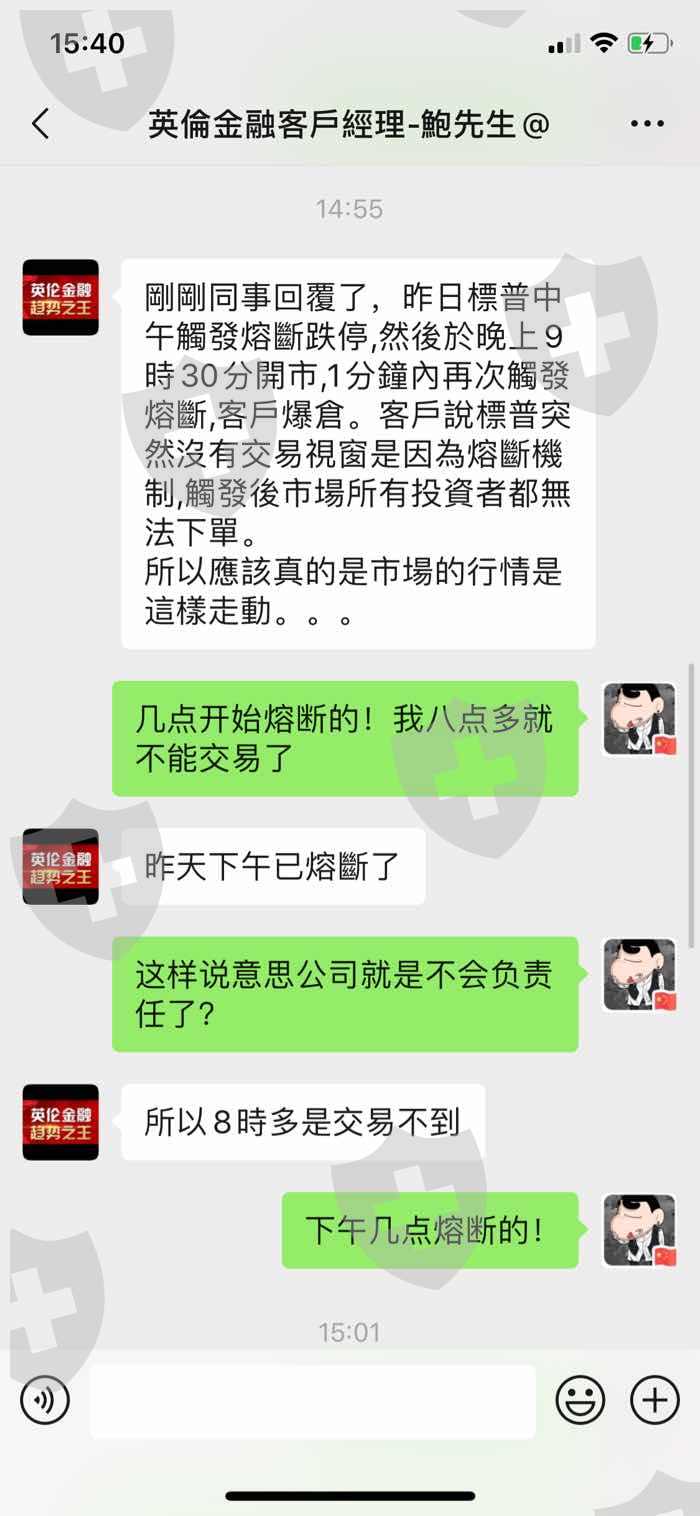 标普500从7点半到9点半数字都没动也不能交易!等到9点半数字跳过来我就爆仓了!交易软件非常卡顿,滑点等问题,反馈客户经理很敷衍,一会说中午就熔断了,一会说晚上熔断,反正就是不想负责任,很失望,每次入金都是私人账户