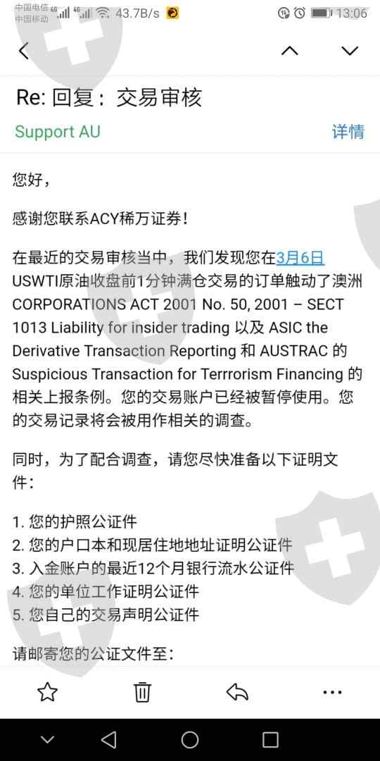 我在ACY稀万证券做原油交易 3月9早上申请出金 平台对我的出金已认可(邮件为证)可是迟迟未见资金到帐 再次登录后台时 发现我的帐号已经无法登录上去 之后联系客户经理 他说平台已把我的帐号给封了 并且不让出金 理由是我违反了他们平台的交易规则 在我再三追问下 说我违反了澳洲的交易法(截图2)做笔单了 怎么就违反了澳洲的法律呢!!!况且我在他们平台以做了几个月 之前从未听说过有什么问题或法律 (截图为证)在我再三和ACY稀万证卷交涉后 他们让我(请看截图3)邮寄到澳洲 还不能电邮 做交易之前我与他们的平台客服聊过 询问平台有没有什么交易限制 客服经理明确地回答我没有任何限制 所以我有理由相信这是一个黑平台 客户的资金安全得不到保障 封客户的账号 是为了不让客户出金所以我希望我们正义的天眼外汇平台帮我一起维权 追回自己应得的资金 顺便曝光一下这个黑平台 提醒一下后面一些朋友 远离这种黑平台