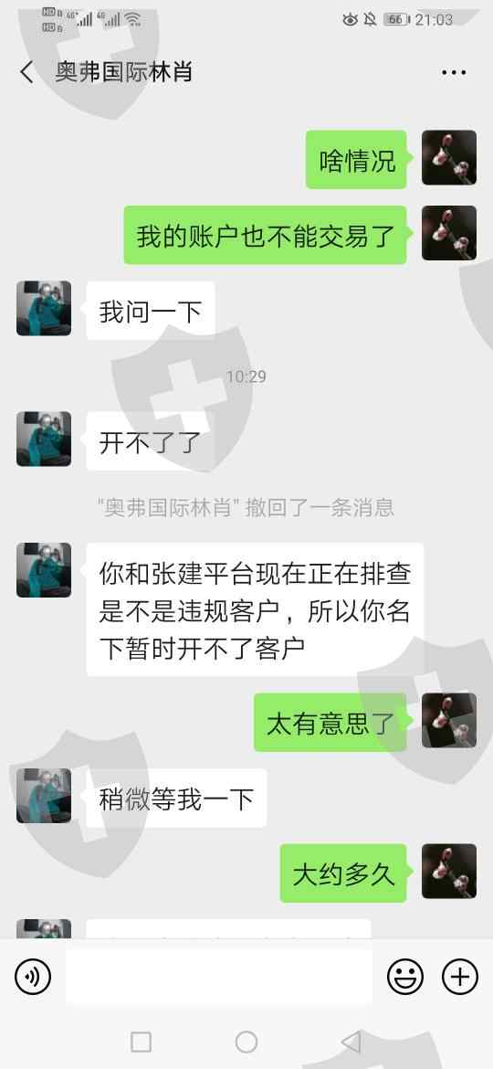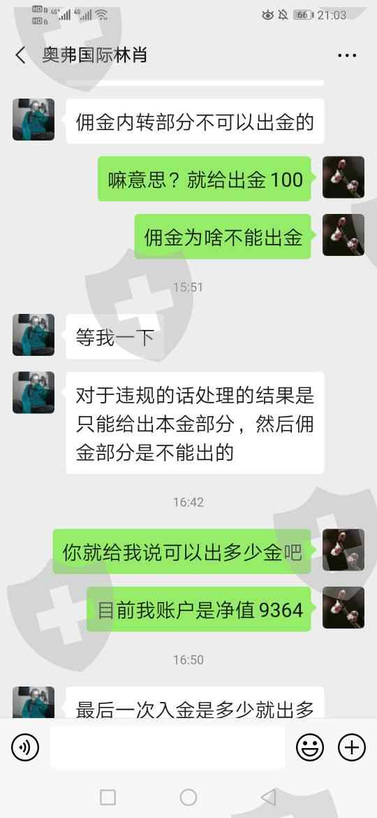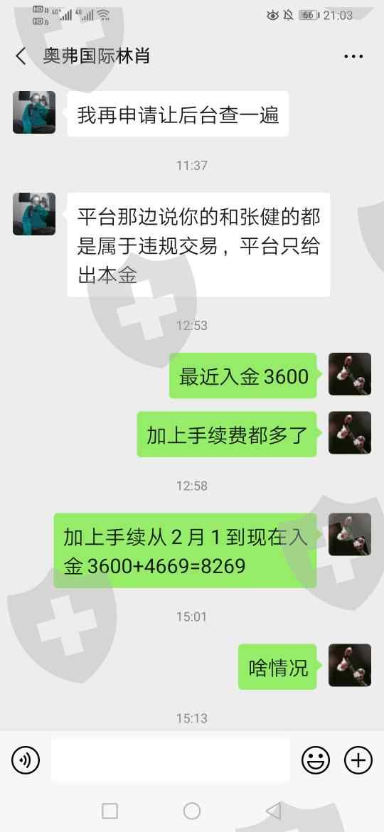 2019年6月份通过外汇110联系奥弗国际,客服介绍,后来客服加微信一直让开户,沟通了几次后因为出金十分钟内到账,再加上外汇110平台测评第一,就开户了,后来就入金共计两个主账户,入金和出金明细见截图,昨天上午十点左右就不能交易了,于是和客服沟通,客服回复违规交易不让做单和出金。目前我两个账户共计金额9845.62美金都不让出金,希望咱们平台给与协助出金并惩罚这黑平台!谢谢!