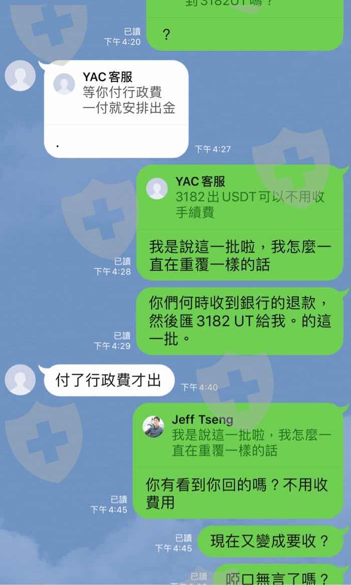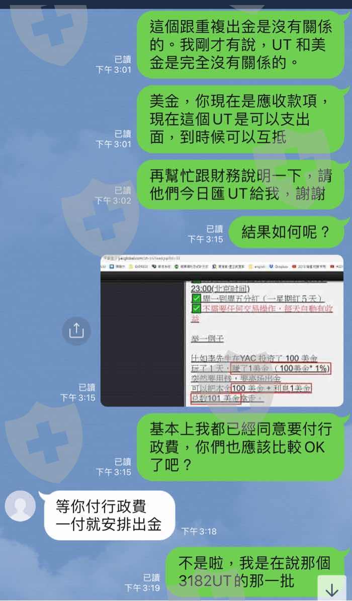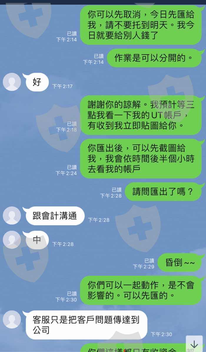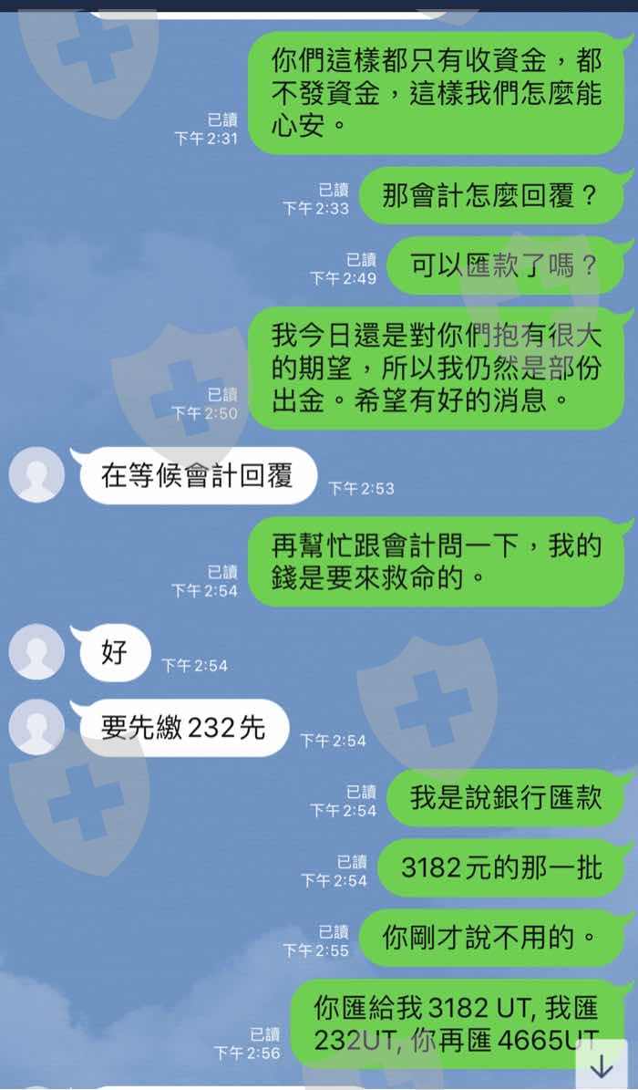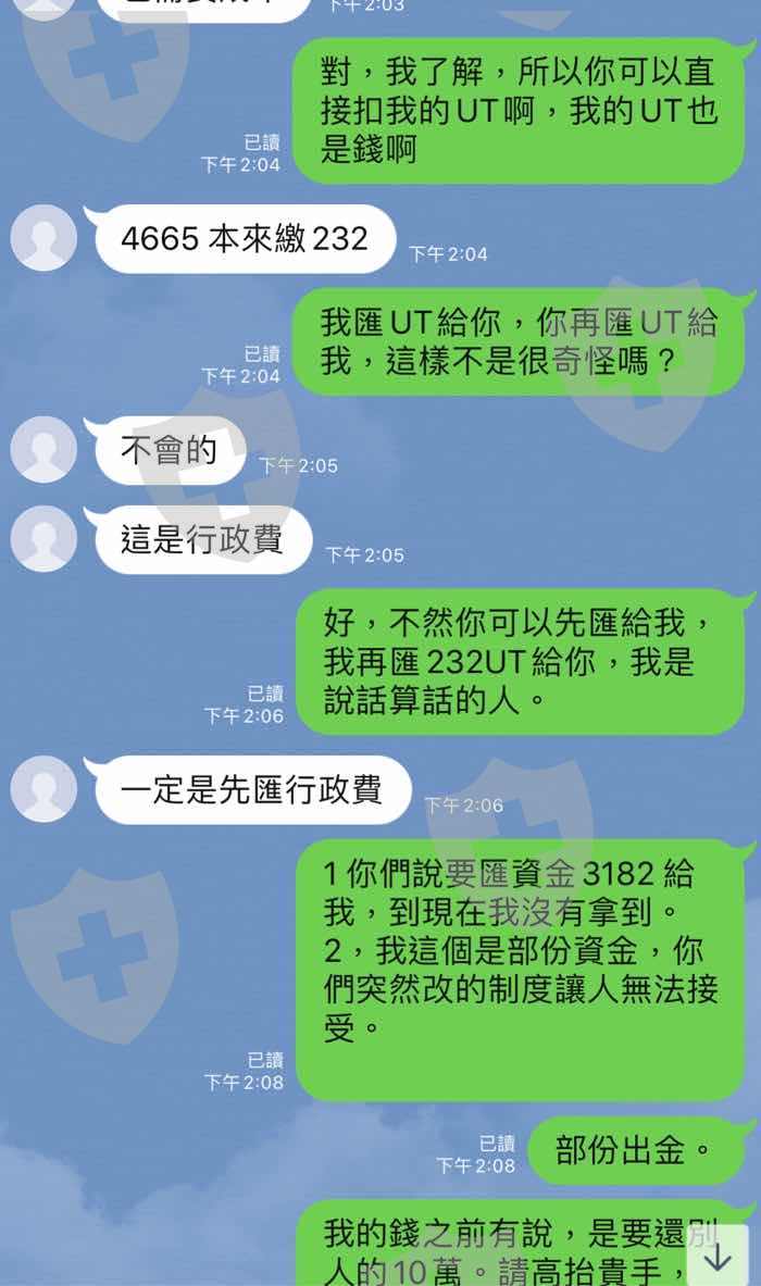 2,出金突然要手續費,且是要先付UT給他們,他們才會再匯UT給我們,我出金4665 UT, 手續費5% 為232 UT, 我先付232UT給他,他再匯4665 UT給我,非常不合理,且不能直接用扣的,4665-232 UT給我。
