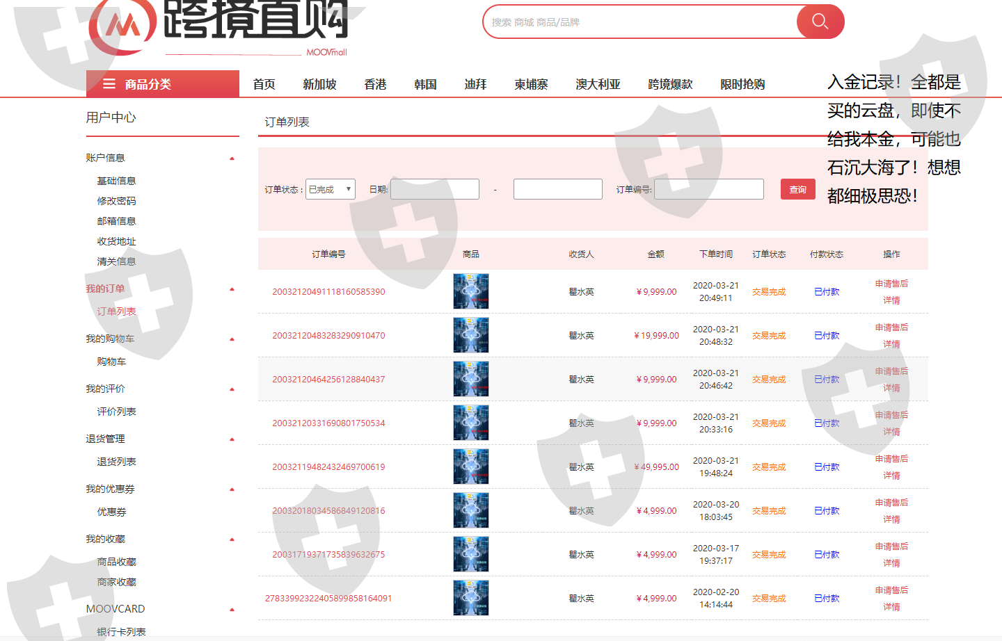 让更多的投资者远离狮子金融集团!同时一同曝光该平台的入金方式!我的入金每一次竟然是买的云储存空间,是一家新加坡的购物平台(所有销量均为0,说明它就是狮子逃避监管和后期追责的皮包公司而已!),我也咨询过了专门处理盈利不给本金的团队,将进一步合作处理!处处是漏洞,处处是坑等你去跳!为了我好不容易赚到的几十万块钱,将继续奔波曝光,同时希望广大交易者朋友不要再被这样无良的做庄的平台所蒙蔽!做交易盈盈亏亏这么多年,第一次见到如此无耻的事情!同平台几十万美金一天的亏损进了他们腰包,我赚几万元就不给出!光吃不出你是貔貅吗?另外我亏损的钱如果是进了国际期货市场撮合制度的另一个交易者的账户也就算了 ,我的亏损拿不出交割单,我的盈利就涉及到你的敏感神经?我赚的是市场的投机盈利,与你狮子金融又何干呢?大家心知肚明了吧!远离嗜血狮子金融集团