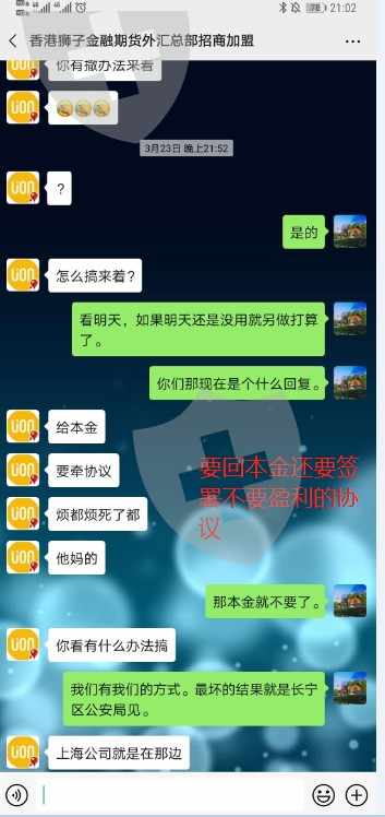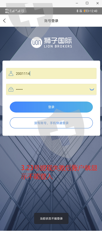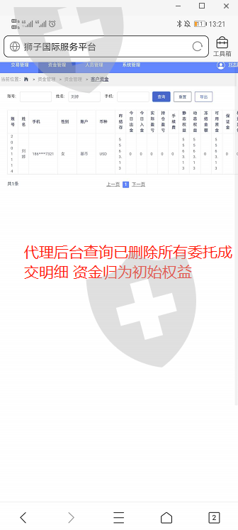 本人刘婷 身份证号 36253219********21 在狮子金融注册国际期货账户交易 账户 2001114 (现已经不能登入) 3.23号 我入金(之前亏损3万人民币)5500美元 手机端 APP 委托挂单交易和手动平仓 因近期美股波动大 盈利3.334万美元后盈利提现均失败 不让出金。想耍赖只给本金 后台私自删除交易委托记录 封了账号让我登入不了。说我延迟交易 并无其他说法 联系就是无尽期的等待!!图片包含成交委托流水 入金记录